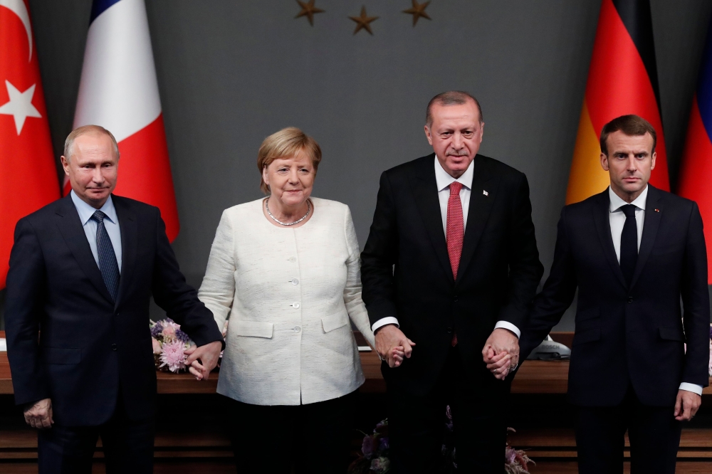 トルコの首都イスタンブールで、シリア情勢への対応を協議するためのロシア、ドイツ、フランス、トルコ4カ国首脳会談が行われ、ヴラジミール・プーチン大統領、アンゲラ・メルケル首相、エマニュエル・マクロン大統領、レジェップ・タイ ...