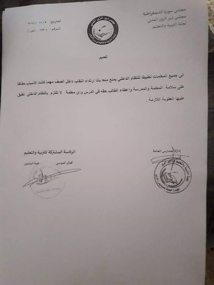 ■ロジャヴァ傘下のダイル・ザウル文民評議会は学校での女子生徒のニカーブ着用を禁止(2018年11月12日)