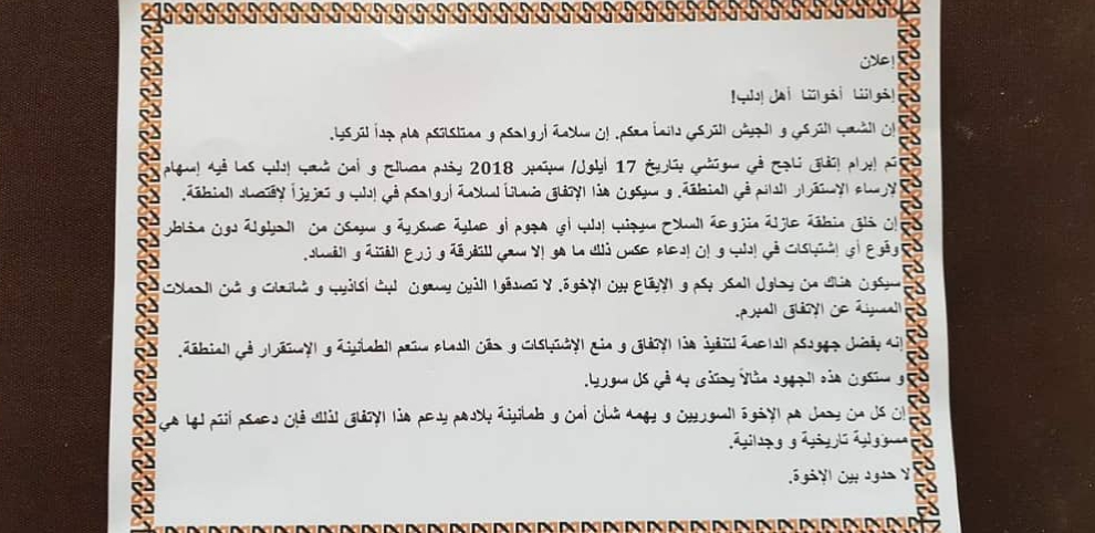 イドリブ県では、ドゥラル・シャーミーヤ(12月1日付)によると、トルコ軍が住民に向けて非武装地帯設置への理解を求める告知を発表した。 この告知において、トルコ軍は「この合意(非武装地帯設置合意)は、あなた方の声明を保障し ...