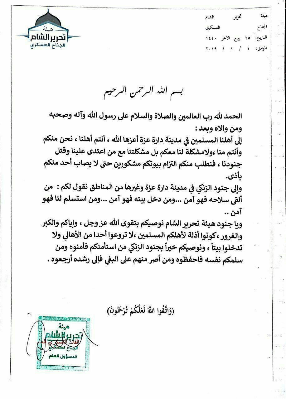 ■シャーム解放機構は国民解放戦線所属のヌールッディーン・ザンキー運動と交戦の末、アレッポ県ダーラ・イッザ市を制圧(2019年1月1日)