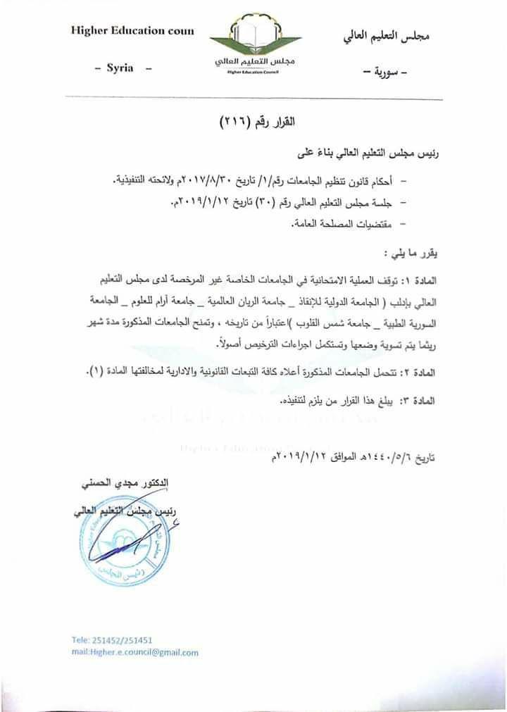 シリアのアル=カーイダであるシャーム解放機構にイドリブ県を中心とする「解放区」の自治と福祉を委託された救国内閣の最高教育評議会のマジュディー・フスニー議長は決定第216号を発し、「解放区」における民営の大学のカリキュラム ...
