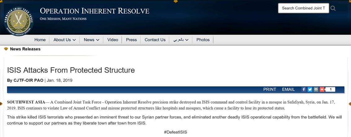 ■親・反体制メディアは米主導の有志連合はダイル・ザウル県南東部に対する爆撃で住民20人を殺害したと報じる一方、有志連合は存在しない村でダーイシュが司令施設として使用していたモスクを撃破したと発表(2019年1月18日)