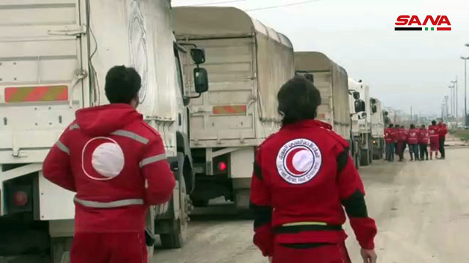 シリア:赤新月社が、米国の支援を受ける北・東シリア自治局支配下のダイル・ザウル県南東部ユーフラテス川東岸のハジーン市一帯に人道支援物資を搬入