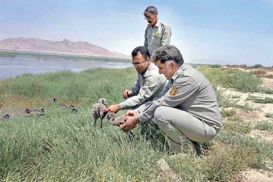 ファールス野生動物生活環境保護事務局長は次のように述べた。「環境活動家の努力や野生動物愛護団体の協力のおかげで、バフテガーン湖の干上がってしまった湖畔で瀕死の状態だったフラミンゴの雛が救出されました。」