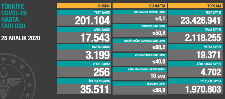 速報:12月25日、新型コロナウイルス感染者数を示す表は保健省からの発表によって更新され続けている。新型コロナ流行に際して対策を講じた後、多くの県で感染者数が減少したのは喜ばしいことだ。保健省の最新の発表によると、過去24時間に20万1104人が新型コロナの検査を受け、1万7543人が陽性と診断され、256人が死亡した。木曜日、新型コロナウイルス科学諮問委員会会議後の発表でコジャ保健相は、テキルダー、ブルサ、イズミル、アンカラそしてサムスンといった県においては感染者数が減少してきていると述べた。保健相はイスタンブルでは感染者数の劇的な減少が見られると述べつつ、集中治療室の病床稼働率は25%と反映されていると語った。以上が、12月25日の新型コロナウイルス感染者数の最新の動向と我が国における感染状況の最新情報である。