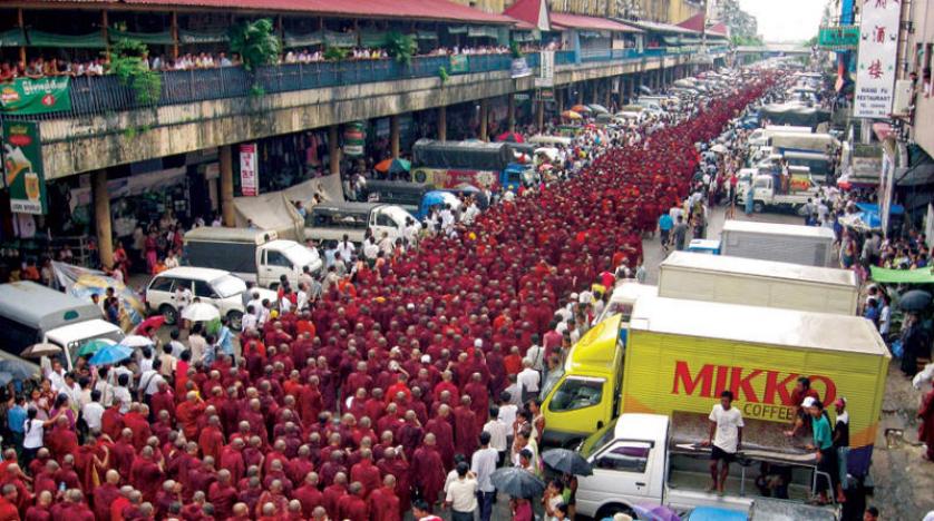 ミャンマーの宗教法は、国内の約30万人の僧侶が投票や政治デモ参加を行うことを禁じている。