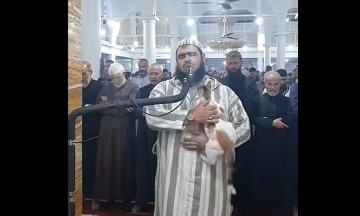 ■猫がタラウィーフの礼拝中にクルアーンを朗唱するアルジェリア人イマームの肩に飛び乗る