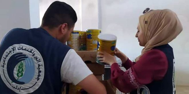 シリア:ビッル社会福祉協会がイドリブ県の田園地帯で住民らに乳児用粉ミルク缶を配給