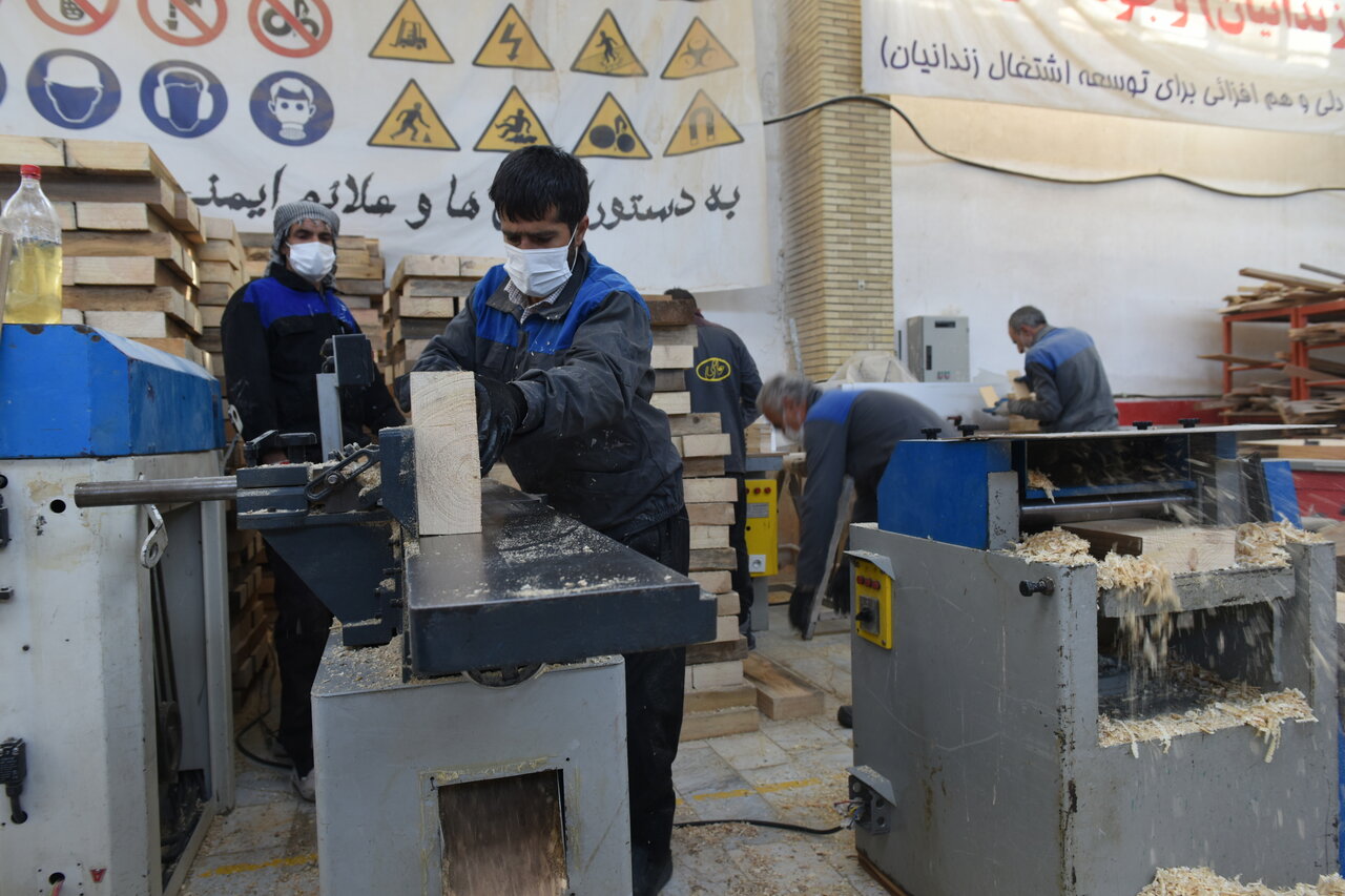 受刑者分類審議室は、どの受刑者が刑務所の外で働くことができるか、またどの受刑者が刑務所で働かなければならないかを決める。620人のマラーゲ刑務所の受刑者は、刑務所内の絨毯織り、縫製、四輪バギーの組み立て、手工芸品の工房で働いている。残りの就労している受刑者はほぼ同数おり、マラーゲ県内や近隣都市の工場や工房で働いている。ジャアファリー氏は、「マラーゲ市外の14の工場がマラーゲ市の受刑者たちを受け入れており、彼らはその仕事に応じて月500万から1,800万トマーンの給与を得ています。(14の就労先の)中には、ボナーブ[訳注1]の四輪バギーの組立工場、ボナーブの伝統的な銅製品の工場、アーザルダーネ・ボナーブ社[訳注2]やザファル製鉄所、異形鉄筋[訳注3]の工房や細骨材[訳注4]工場などがあります」と話す。