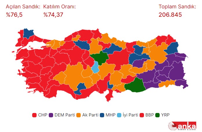 「現在、我々の手元に入っている情報によると、アダナ、アンカラ、アンタリヤ、アイドゥン、エスキシェヒル、メルスィン、ムーラ、テキルダー、イズミル、イスタンブルで、再び勝利した。バルケスィル、ブルサ、マニサ、デニズリの市長を新たに奪取した。」