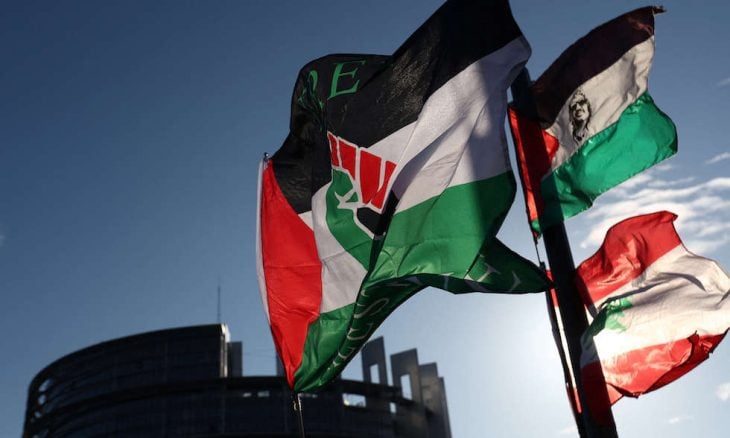 パレスチナ:ストラスブールの欧州議会本部前でパレスチナ人民への連帯デモ