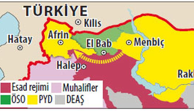 アサドもトルコに敵対しているため、支配下のピンクの地域の使用許可をPYDに与えた。