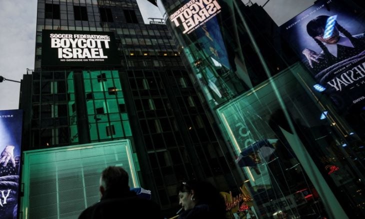 複数のアドボカシー団体とサポーターグループを含む連合は昨日火曜日、欧州サッカー連盟に対し、タイムズスクエアの広告掲示板を通してイスラエルのボイコットを呼びかけた。彼らはこれによって、「ゲームオーバー・イスラエル」または「イスラエルよ、ゲームは終わった」と題するキャンペーンを、ワールドカップ開始の数か月前に始動することとなった。