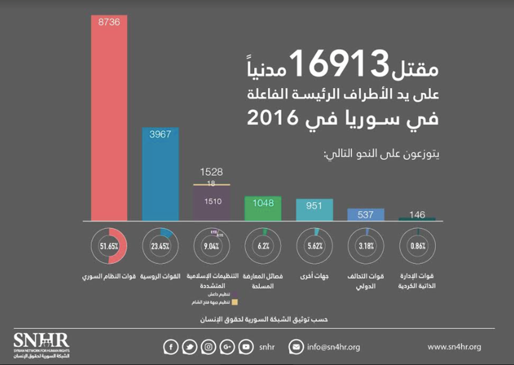 シリア人権ネットワークは、2016年の1年間で、シリア軍とロシア軍による攻撃で死亡した民間人の数が1万6,913人にのぼったとする統計データ( ...