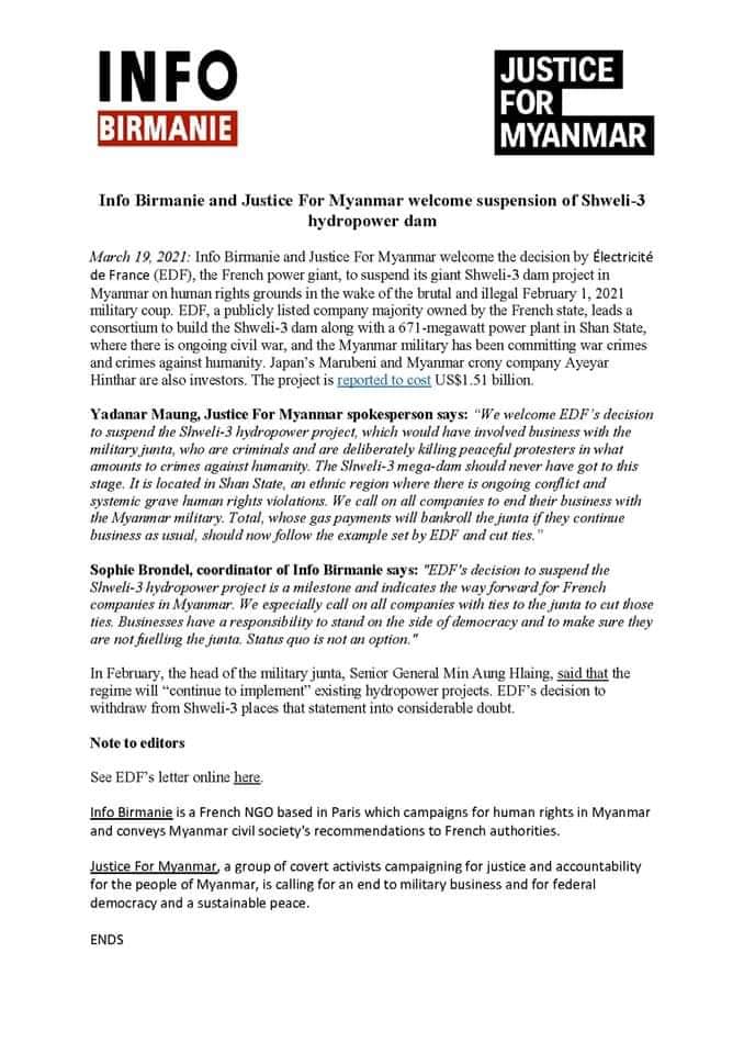 フランス政府は、大株主となっているフランス電力会社(EDF:Electric de France)による、総額15億1千万米ドル相当のシュエリー第3水力発電プロジェクトを中止した。Justice For Myanmar は本日それを歓迎すると発表した。