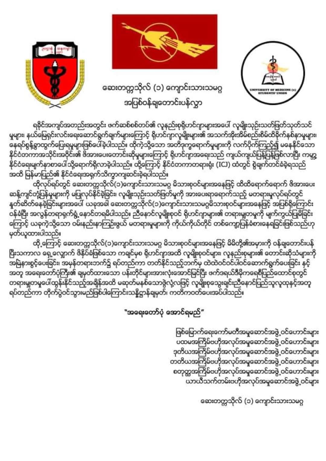 それゆえ、第一医科大学学生連盟一同は、自らの過ちを認め謝罪するとともに、今後は抑圧されているカチンからロヒンギャにいたるまでの諸民族、マイノリティが求める声に常に耳を傾け、正義の側に立って、できうる限り真正面から加わり行動していくこと、また革命が目指す目標をすべて達成し、フェデラル民主主義連邦において、正義がその威光を取り戻すまで、引き下がることなく粘り強く同胞民族兄弟国民とともに、闘い抜く覚悟であると決意し誓うものである。