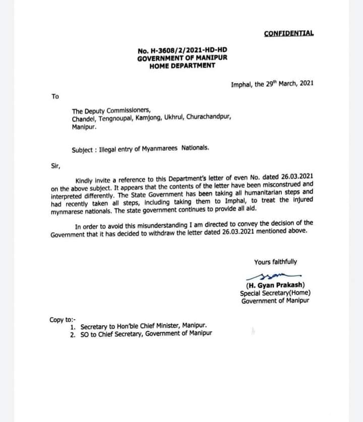 インド、マニプール州は、戦闘避難民であるミャンマー国民を援助しないようにとする文書を3月26日に発表したが、その命令書を撤回したと3月29日に発表した。負傷者と戦闘避難民に援助を提供していくとも記されている。