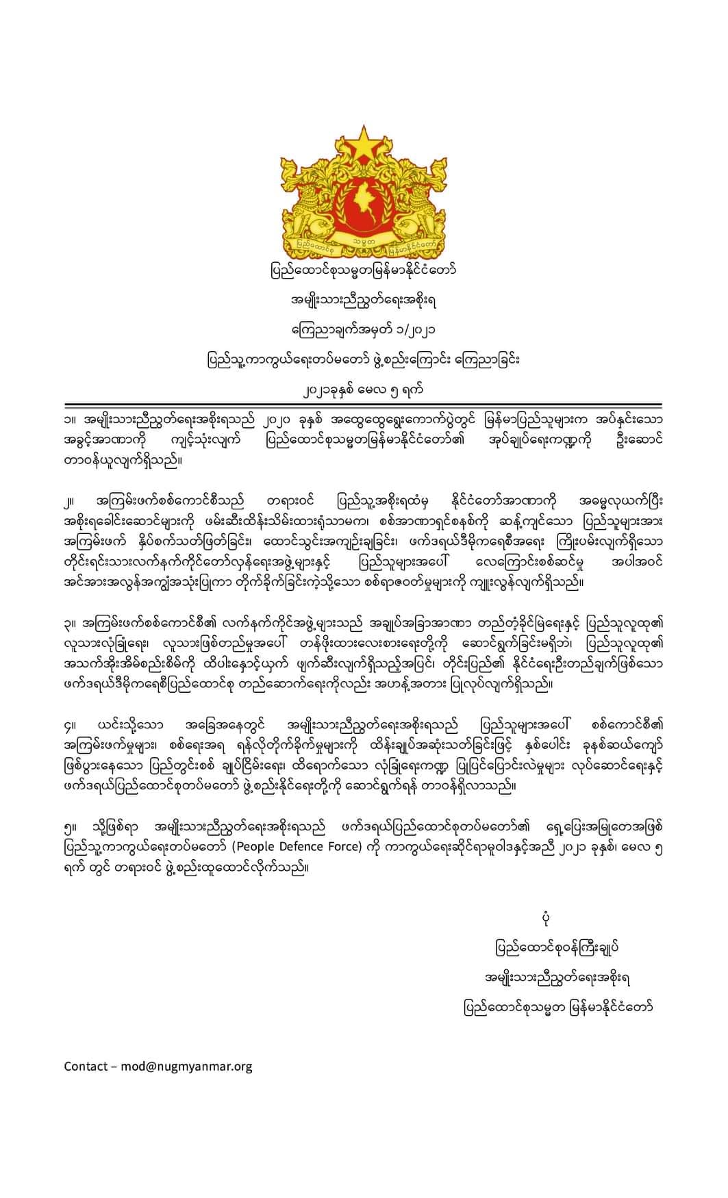 その声明では,テロリスト軍評議会が,合法的な国民政府から国家権力を不当に奪取し,政府の指導者らを逮捕・拘束しただけでなく,軍事独裁体制に反対する国民を暴力的に弾圧、殺害、投獄し,フェデラル民主主義のために奮闘する少数民族武装革命組織と国民に対し、空爆を含む過度な武力行使による攻撃を続けており、それらは,戦争犯罪にあたると記されている。