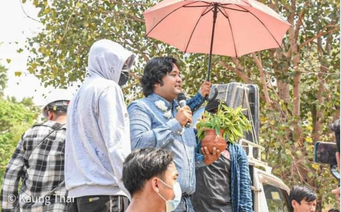 コー・ウェーモーナインはモンユワの路上でバイクに乗って抗議活動を行っていたところ、水かけ祭り2日目である4月15日の午後、軍評議会の武装集団が車で衝突して拘束したものである。