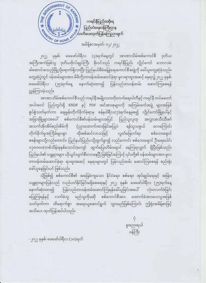 2月3日にクーデターを起こした軍のソーウィン副総司令官が州を訪問し、同省職員に対して地位、立場に相応しい通常業務に戻ることを要求したことに対し、カレンニー州内務省は本日、それに従わないことという指令を発表した。