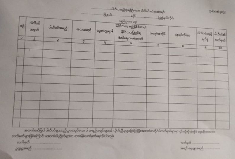 「政党名を書く欄を空白にし、村側が家々を一軒ずつ訪れ、書類に名前と、身分証と一致する署名を強引にさせている。ニャウンドン郡ニャウンゴン村では今日署名させられた。十戸長に大量の書類を渡しこの業務をさせていた。どこの政党かということは言わない。政党名を書く欄を空白にしつつ、署名が済んでから彼ら自身が政党名を埋めるという意図がある。これは地区管理委員会が行っているのだ。ニャウンドン市に期限内に送らないといけないと言って、強引に署名させているのだ」と地元住民が述べた。