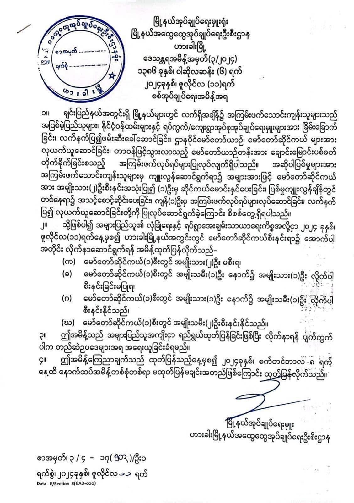 ハーカー郡総合行政局の発表によると、チン州内の郡では現在、罪のない市民や国家公務員や地区及び村の行政長への脅迫、武器で脅して連行、役所の所有する自動車やオートバイの強奪、公務で移動する自動車への待ち伏せ銃撃が行われており、こうした犯行の際、多くの場合、男性2人がオートバイを2人乗りし、1人が攻撃していることから今回の地方命令が発せられたという。