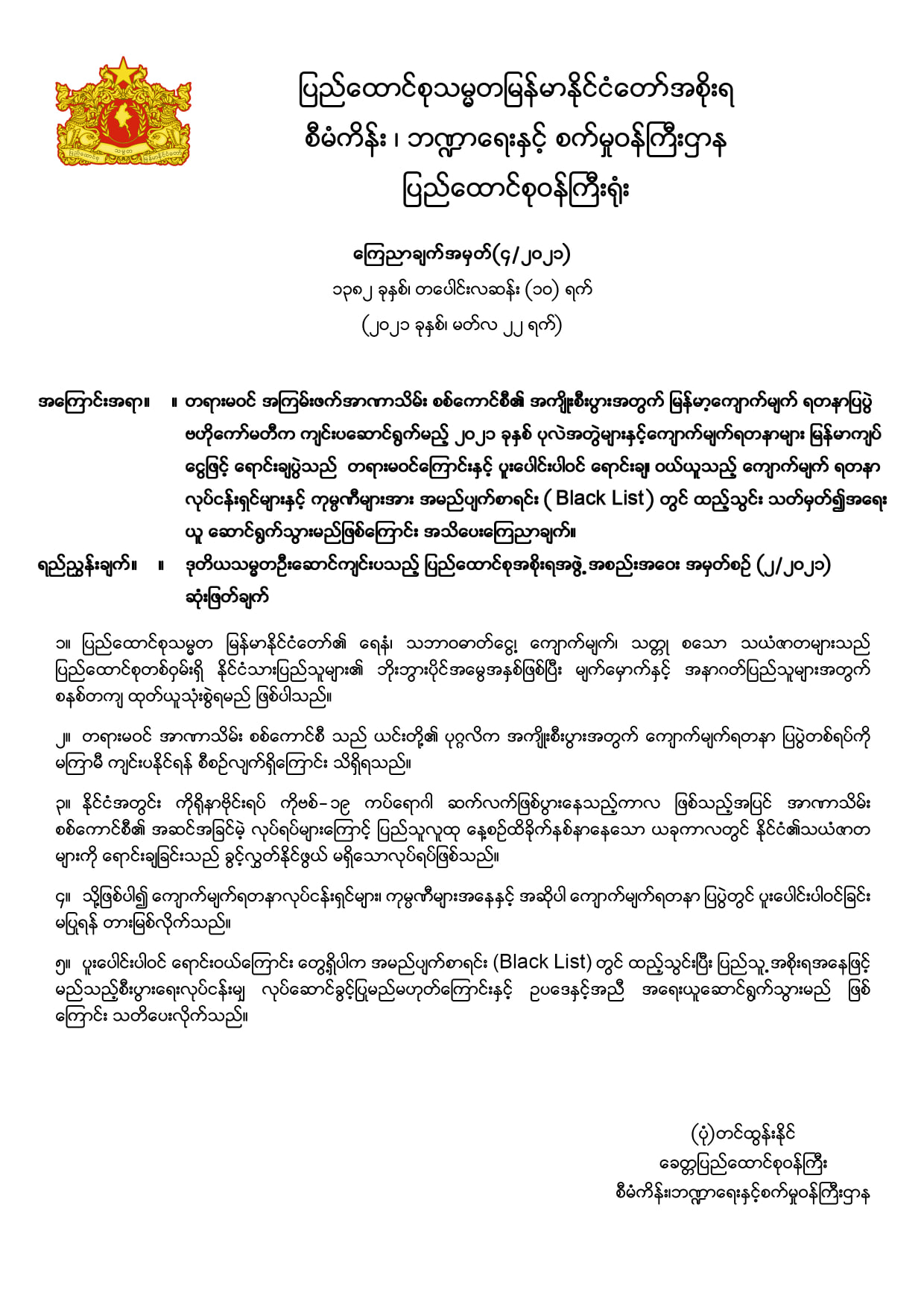 軍評議会の私的利益のために、ミャンマー宝石展示会中央委員会が真珠と宝石をチャットの現金で販売する展示会を開催する準備をしており、事業主らに加担しないようCRPHが阻止したものである。